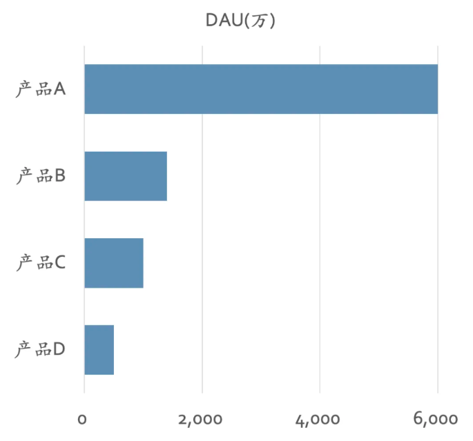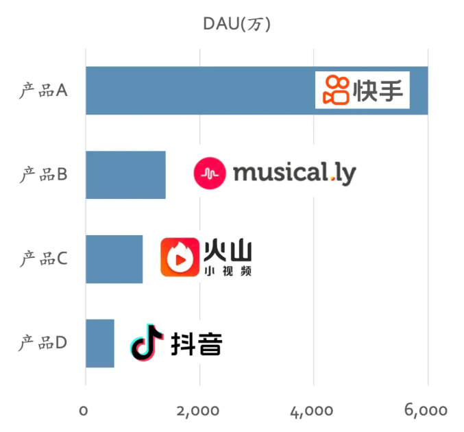 这四款都是短视频APP,分别以 A、B、C、D 来代称。它们当时的日活跃用户(DAU)规模差异明显,如图所示:产品A约 6000 万,产品B约 1600 万,产品C约 1000 万,而产品D则只有大约 500 万。
