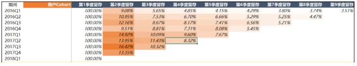 这是一家电商平台,所以首先从最关键的复购率来看,这家公司次季度留存只有 10%–13%,一年后的留存只有 4%–6%。可以给大家一个参考:作为对比,唯品会的长期留存在 20% 左右。